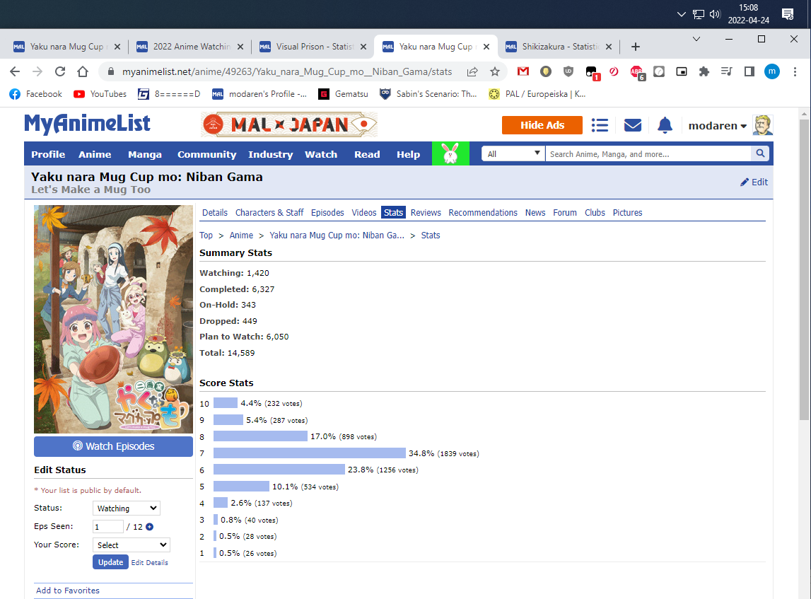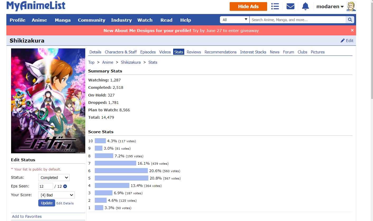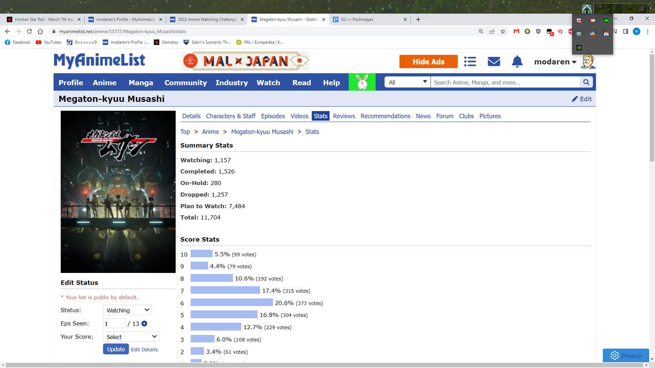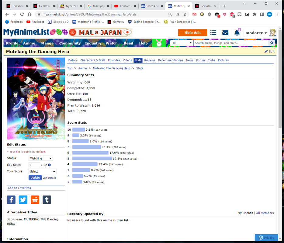 Initial Post Number: #671โข ๐๏ธ Challenge Start Date: January 17, 2022 ๐ฐ Challenge Finish Date: June 28, 2022 ๐ Link to your completed anime list: https://myanimelist.net/animelist/modaren?status=2 ๐ Link to your Anime+: https://anime.plus/modaren ๐บ๏ธ Completed Anime (on sign-up date): 2203 ๐ Time Zone: GMT+1(GMT+2 from 27 mar) ๐ฒ Difficulty Level: 5 ๐ฒ Full-Challenge Restriction: Taskmaster ๐ง Anime in Forum Avatar/Signature: N/A ๐ฎ Legend: Watching - Completed - Inactive/Plan to Watch โ๏ธ Challenge list: โ๏ธ DATE FORMAT: MMM DD (example: Jan 01)