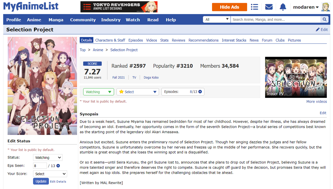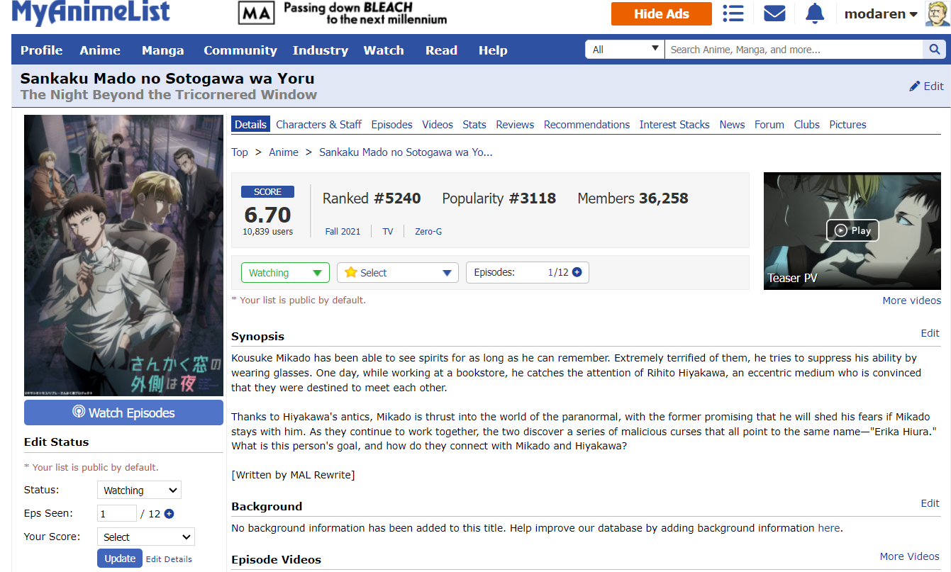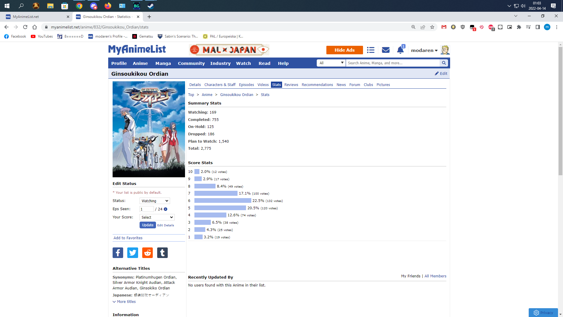 Initial Post Number: #671โข ๐๏ธ Challenge Start Date: January 17, 2022 ๐ฐ Challenge Finish Date: June 28, 2022 ๐ Link to your completed anime list: https://myanimelist.net/animelist/modaren?status=2 ๐ Link to your Anime+: https://anime.plus/modaren ๐บ๏ธ Completed Anime (on sign-up date): 2203 ๐ Time Zone: GMT+1(GMT+2 from 27 mar) ๐ฒ Difficulty Level: 5 ๐ฒ Full-Challenge Restriction: Taskmaster ๐ง Anime in Forum Avatar/Signature: N/A ๐ฎ Legend: Watching - Completed - Inactive/Plan to Watch โ๏ธ Challenge list: โ๏ธ DATE FORMAT: MMM DD (example: Jan 01)