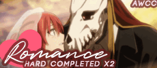 Romance Challenge Easy 25/25 | Med 35/35 | Hard 45/45 Only use anime tagged as Romance or Romantic Subtext. Difficulties: Easy: 25 items Medium: 35 items Hard: 45 items — There are extra requirements, you only need to do those required by your difficulty. (added on Feb 05, 2020 *) This challenge can be completed thrice (x3) for each difficulty. (added on Jun 24, 2020) — To attempt this, you have to complete all difficulties (three separate attempts) once/twice. — Your new attempt has to be in a new post, with new entries. — You must not add anything to your previous post after completed. — More information can be found here. Previously completed series aren't allowed except for Easy difficulty the first time through. — Make all previously completed entries in italics. — Series previously started, but not finished, may be used. — Airing can be used, but you must complete the series, so you can only turn-in the challenge after the series has finished airing. Any type is allowed, but must be equal to or longer than 15 minutes (total). — Unless otherwise stated. Your challenge "Starting Date" is the day you post. — Remember that it's required to add the start and end dates to any anime you use for our challenges. You cannot use the same entry more than once across all difficulties. HoF Checklist Starting Date: February 02, 2023 Ending Date: March 28, 2024