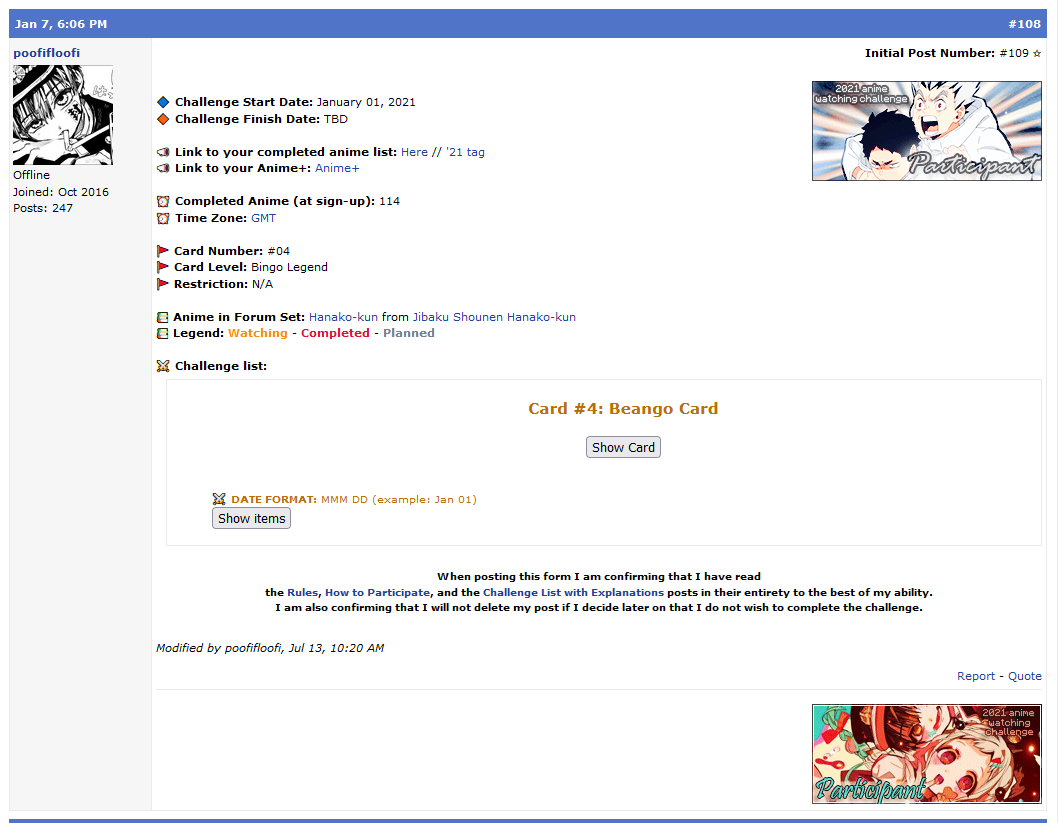 Initial Post Number: #104✩ × Challenge Finish Date: October 07, 2021 × Link to your completed anime list: List × Link to your Anime+: Anime+ × Completed Anime (at sign-up): 78 × Time Zone: GMT+1 × Card Number: #06 × Card Level: Bingo Legend × Restriction: Endurance × Anime in Forum Set: N/A × Legend: Watching - Completed - Inactive/Plan to Watch × Challenge list: