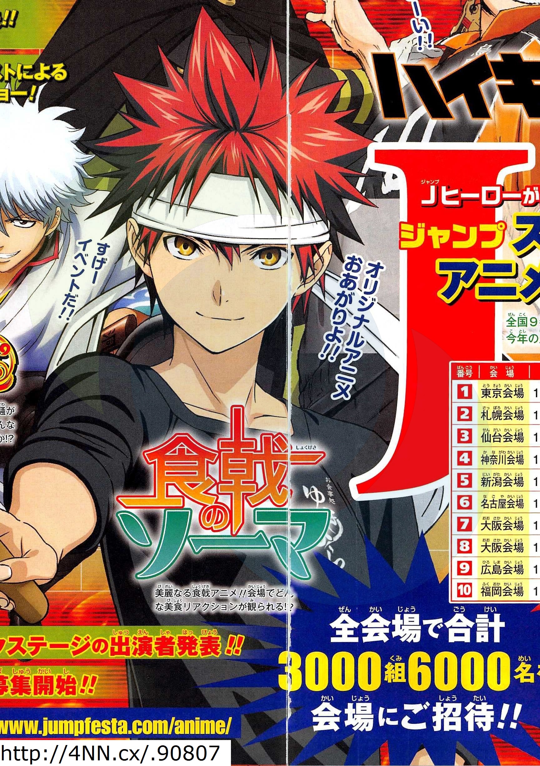 A scan from the 39th issue of Weekly Shounen Jump magazine will be announcing on Monday that this year's Jump Festa Anime tour will show an original Shokugeki no Souma anime special.