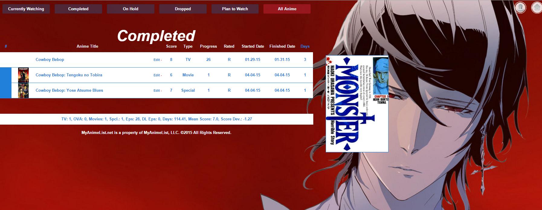 DRedDogPE said: Madara22 said: It's good I tested it but One piece has Death Note's cover and Cowboy Bebop has Monster's cover... Those are just the one's I found . :/ It's only like that if I use the all one. Not if I use anime only one. This is now fixed if you use the @import "http://mal-image.appspot.com/all/USERNAME"; as i have made it detect what list it is being requested from so that it loads correctly. Thanks seems like Fellow Writer is down and this helps a lot sorry for the late reply we just got the quote thing now :X |