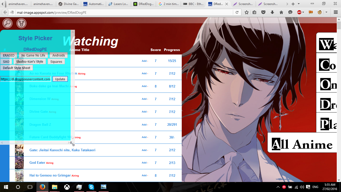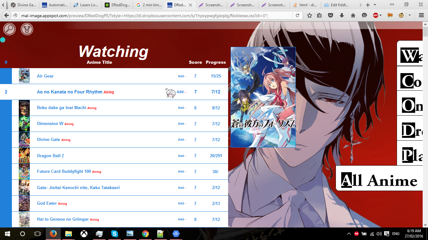 #more1 td:before, a[href^="/anime/1/"]:before { background: url(http://cdn.myanimelist.net/images/anime/4/19644.jpg); } /* Cowboy Bebop */Second: I compared load times vs my static pre-generated CSS and there is a difference of around 200ms. (file: ~600ms, generated: ~800ms) ... my free host kinda sucks... Either way, it's a pretty long delay to load the list. This leads back to my previous question about caching the data. If this is hitting the MAL API with every request, that isn't going to scale well. If you share a bit about how it works I might have some ideas on how to improve performance. Third: Do you like quirks mode? On a different note, it might be a useful idea to have fields for people to select anime/manga and put in their username. Then generate the entire URL for them. It might be a bit much to expect MAL users to be able to encode their CSS and put it in the right spot. Overall this is looking really good. |