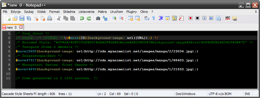 Doomcat55 said: DRedDogPE said: Ok, that works now, thanks.Doomcat55 said: Using the "all" operation on the "advanced code" import makes it ignore the coded style and default to #more CSS. btw this generator is great, kudos for making and sharing it! Much appreciated On it now Edit: You can now use ?code= with the all Doesn't seem to be updating, though - I added Tsukimonogatari (28025) to my list today and it hasn't generated a cover. Change your import code to this .animetitle%5Bhref%5E%3D%22%2F%5BTYPE%5D%2F%5BID%5D%2F%22%5D%7Bbackground-image%3Aurl%28%5BURL%5D%29%3B%7D You didnt add a / at the end of the numbers TO |