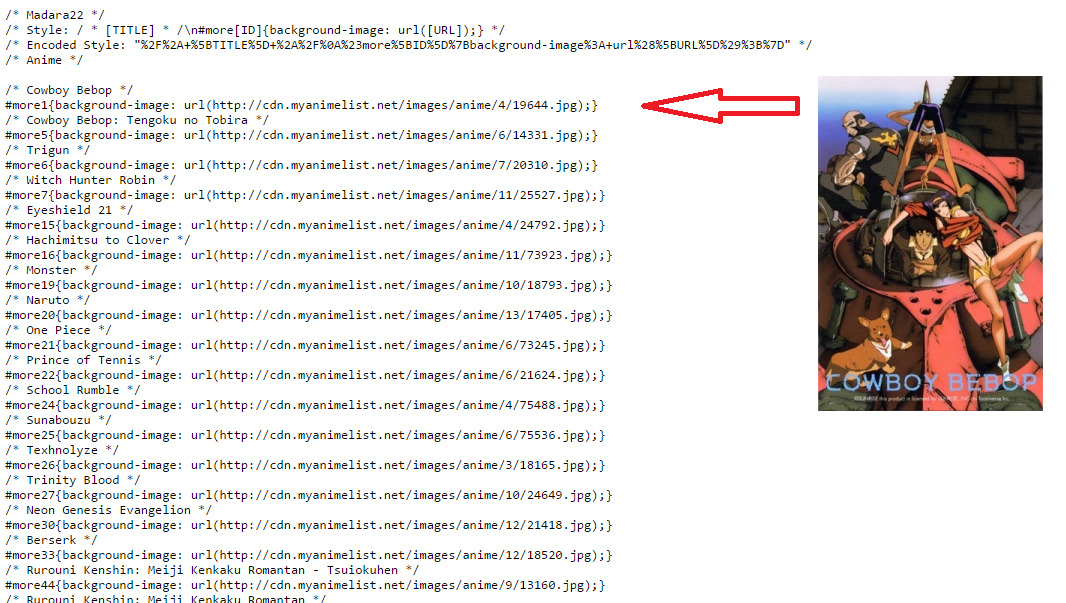 /* Style: #more[ID] td:before, a[href^="/anime/[ID]/"]:before { background: url([IMG]); } /* [TITLE] */ */