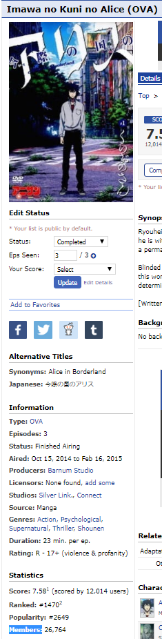 #02 (x2) 20/20 [✓] Watch an anime that aired on the 2nd day: Ryo any month/year [✓] Watch a series that aired in the 2nd month: Noblesse: Awakening February, any year [✓] Watch a series that aired in a year ending in 2: Shiranpuri (Movie) Example: 2002 [✓] Watch a series with 2 in the title: Ansatsu Kyoushitsu 2nd Season numerical or alphabetical [✓] Watch a series with 2 in an alternative title: Darker than Black: Ryuusei no Gemini can overlap with original title [✓] Watch a series with a main character that has 2 in their name: Bannou Yasai Ninninman [Ninninman] list character [✓] Watch a series with 2 characters listed: Fumiko no Kokuhaku [✓] Watch a series ranked with 2 in it: Puka Puka Juju [screenshot] Example: #102; screenshot recommended [✓] Watch a series with a popularity that has 2 in it: Lord of Vermilion: Guren no Ou [screenshot] Example: #912; screenshot recommended [✓] Watch a series favorited 200 to 299 times: Sword Art Online: Sword Art Offline [screenshot] Example: 288 favorites; screenshot recommended [✓] Watch a series with total members between 20,000 and 29,999: Black Jack [screenshot] screenshot recommended [✓] Watch a series with 2 episodes: Time Bokan Oudou Fukko [✓] Watch a series with 22 min. per ep.: Banana Fish [✓] Watch a series with only 2 recommendations: Kizuna Ichigeki [screenshot] screenshot recommended [✓] Watch a series with 2 forum discussions: Uchuu Show e Youkoso [screenshot] 2 topics; screenshot recommended [✓] Watch a series with the least number of votes in 2: Akagami no Shirayuki-hime 2nd Season [screenshot] under Score Stats; screenshot recommended [✓] Watch a series that was reviewed on day 2: Koro-sensei Quest! [REVIEW] any month/year, link to it [✓] Watch an anime tagged as Adventure, Samurai, Game, or Police: AD Police Alternative Requirements: [✓] Watch an anime that aired on the 12th day: Chocolate Underground [✓] Watch a series with a rating that has 2 in it (Ex: 7.82): Sono Hanabira ni Kuchizuke wo: Anata to Koibito Tsunagi [screenshot] |