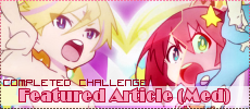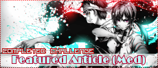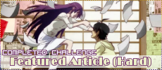Featured Article Challenge Easy 4/10 | Medium 0/20 | Hard 0/30 | Conquered 0/40 Difficulties: Easy 10 | Medium 20 | Hard 30 | Conquered 40 Cannot use and/or re-watch previously completed series; watching, on-hold, and/or dropped series are allowed. Any type is allowed, but it must have 10+ episodes and a duration of 15+ minutes total. Airing can be used, but you must COMPLETE the series, so you can only turn-in the challenge after the series has finished airing. Start date is the day you post. Search for an article with anime linked in them (used as example, as the main theme, and so on). Use those anime for this challenge. You can use the same article up to two (2) times with different anime. Each anime can be used once. Find featured articles here. if the article is about books (manga, light novels), you can still use as long as the series has an anime counterpart. Starting Date : 09-oct-2018 Ending Date :