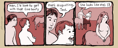 | Say, has anyone posted this yet? http://pbfcomics.com/comics/disgusting-ted/ Konani said: My guess; MonMusu is there as a nod to the other, very similar, anime/manga that resemble this anime/manga in many ways. Yeah, it's clearly a meaningless easter egg. But it's fun to speculate about the implications nonetheless. :) Konani said: -and isn't it kinda sexist or something to assume that a girl reading ecchi manga oriented toward a male (or something) audience isn't straight? myself read DearS- lots of fanservice, lots of laughs, lots of interesting ideas and concepts, no actual sex, but still very enjoyable. -yes i am a female, no i have no sexual interest in other females. i do watch harem and hentai. I guess it might be sexist...? Regardless, that assumption is what would probably happen between friends at least in the society I live in. Ignoring the throwaway easter egg nature of the manga choice, I'd speculate there might be a general assumption that http://tvtropes.org/pmwiki/pmwiki.php/Main/EveryoneIsBi ...but then would they perhaps be more reluctant to let each other look at their genitals? To be clear, none of this actually bothers me in any way. :D Thing this brings to mind #1: a conversation between two lesbians in the Nightwish lastfm shoutbox about seven years ago, about their confidence in their own "gaydar" increasing upon reading an article about a study on gaydar accuracy rates. Thing this brings to mind #2: http://www.cracked.com/article_18593_6-classics-despised-by-people-who-created-them.html According to [Brokeback Mountain author] Proulx, since the release of the movie she has been inundated with alternative scripts, sequels, sexually explicit retellings and "fixes" that change the ending of the story so that the two star-crossed cowboys end up together. And unlike most fanfiction writers, who tend to keep their habits confined to niche message boards, Star Trek web rings and other shame ridden corners of the Internet, Brokeback Mountain fans apparently like sending their work directly to the author's address. Surprisingly, Proulx says most of the fanfiction is written by people claiming to be straight males. So ladies, now you know what your boyfriend is doing on the laptop late at night when he claims to not be looking at porn. I'm a straight male and I liked Brokeback Mountain, but I took a 100-question test once according to which I'm 13% gay, so.... Cratex said: GreenTea13 said: From my experience, no. They don't. However, guys like to *imagine* girls sit around and talk about this stuff. Otherwise, they (guys) got nothing to live for :DSeriously... is this what guys think girls sit around talking about? Haha! Thing this brings to mind: a female coworker in her late 60's once commented, "Male and female private parts are about the ugliest things in the world." I was like, huuuuuuuuh? |