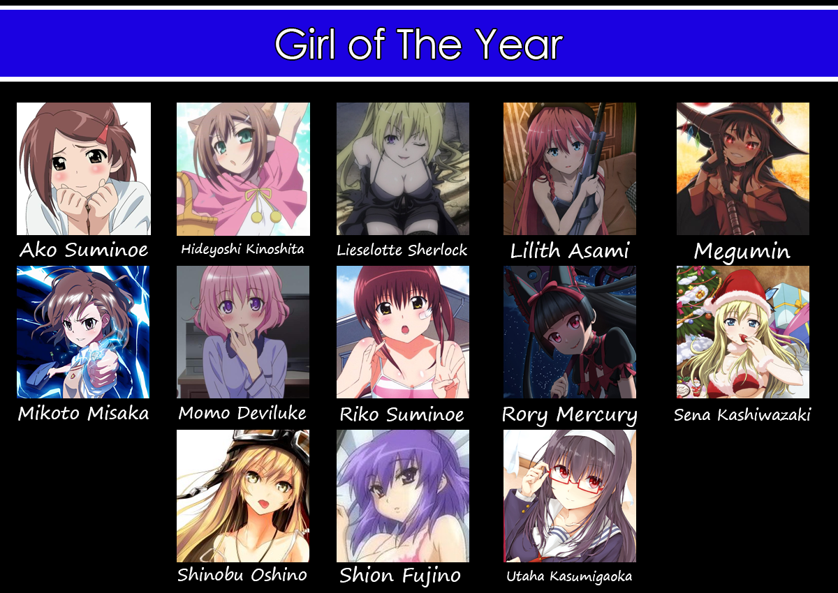 | 1. Ako Suminoe: 8.5/10 2. Hideyoshi Kinoshita: 1/10 3. Lieselotte Sherlock: 8/10 4. Lilith Asami: 7/10 5. Megumin: 9/10 6. Mikoto Misaka: 9/10 7. Momo Deviluke: 8/10 8. Riko Suminoe: 9/10 9. Rory Mercury: 9/10 10. Sena Kashiwazaki:-/10 11. Shinobu Oshino: -/10 12. Shion Fujino:-/10 13. Utaha Kasumigaoka:-/10 I predict: 1.Megumin 2.Momo 3.Shinobu |