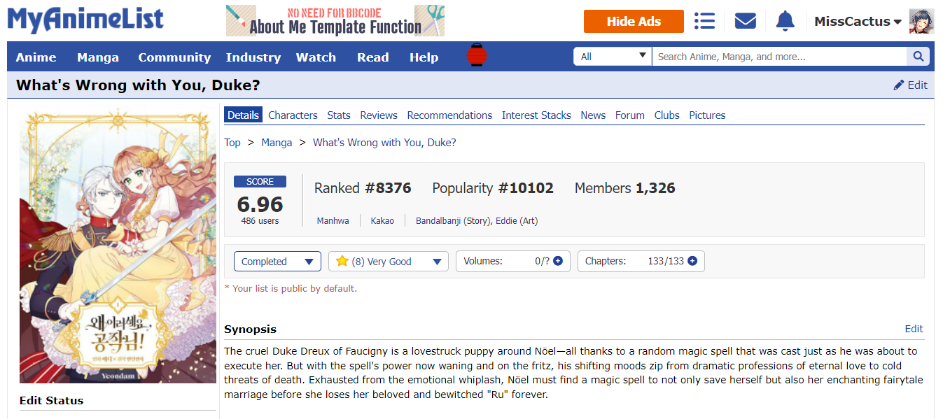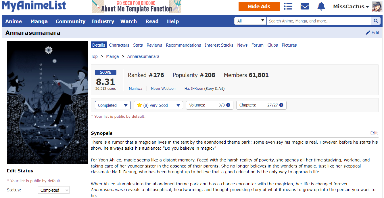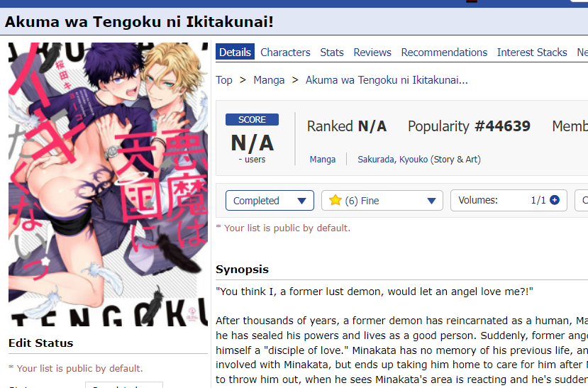 #06 Challenge - 0/20 Read a manga that released on the 6th day (any month/year) Read a manga that released in the 6th month (June, any year) Read a manga that released in a year ending in 6 (Example: 2006) Read a manga with 6 in the title (numerical or alphabetical) Read a manga with 6 in an alternative title (can overlap with original title) Read a manga with a main character that has 6 in their name (list character) Read a manga with 6 characters listed Read a manga ranked with 6 in it (Example: #601) *** Read a manga with a popularity that has 6 in it (Example: #961) *** Read a manga favorited 600 to 699 times (Example: 688 favorites) *** Read a manga with total members between 60,000 and 69,999 *** Read a manga with 6 chapters Read a manga with 6 volumes Read a manga with 6 recommendations *** Read a manga with 6 forum discussion (6 topics) *** Read a manga with the most number of votes in 6 (under Score Stats) *** Read a manga one of your friends rated with 6 *** (link friend) updated! Read a manga that was reviewed on day 6 (any month/year, link to it) Read a manga tagged as Horror, Slice of Life, Mecha or Romance Read a manga from Afternoon or LaLa DX *** - screenshots recommended |