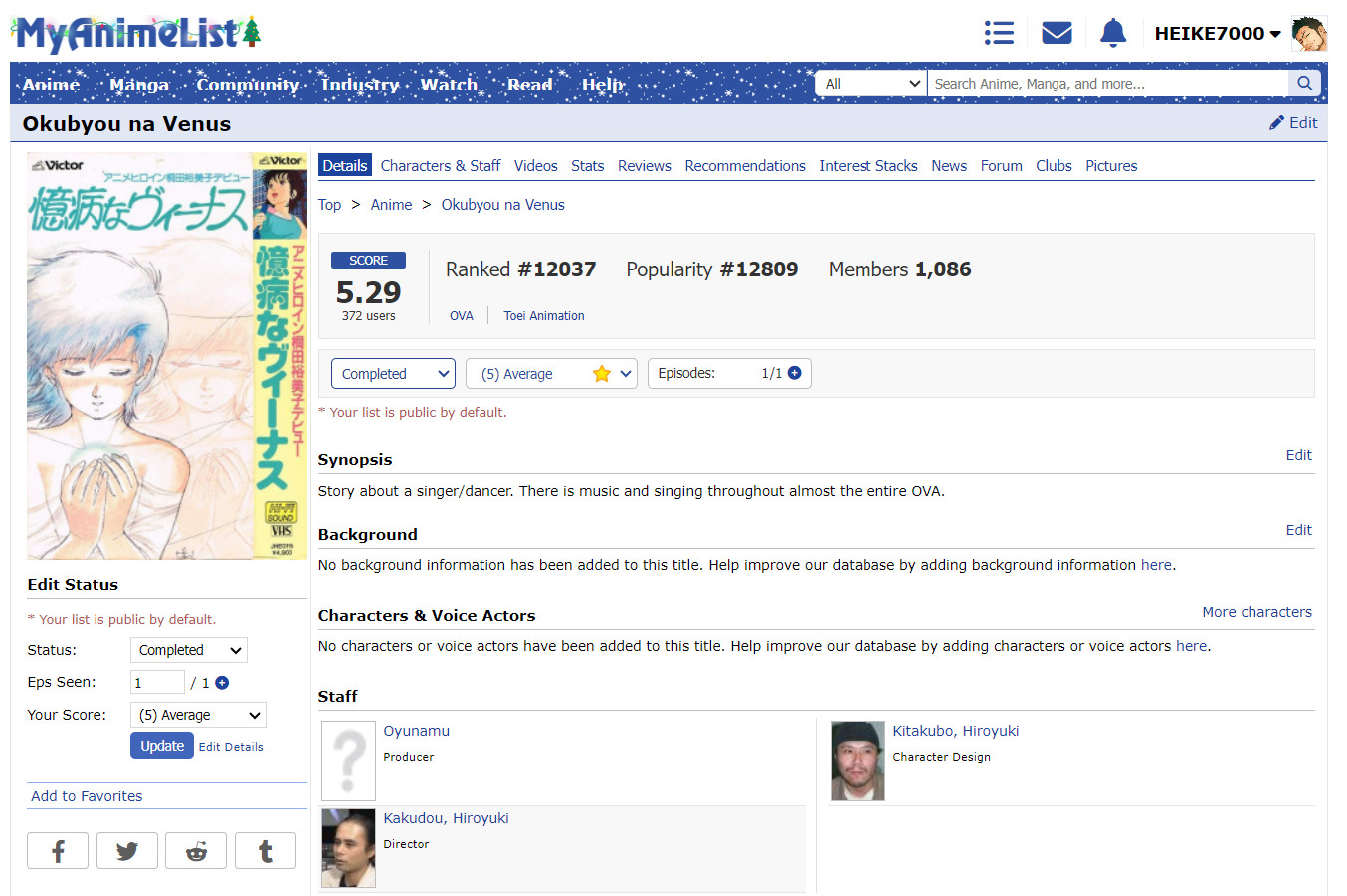 [X] Watch an 80's TV Series: [X] Watch a second 80's TV Series: [X] Watch an 80's Movie: Ie Naki Ko (Movie) [X] Watch a second 80's Movie: Ginga Tetsudou 999: Glass no Clair Starting Date: July 16, 2024 Ending Date: [X] Watch an 80's TV Series: [X] Watch a second 80's TV Series: [X] Watch an 80's Movie: Lady Lady!! (1988) [X] Watch a second 80's Movie: [X] Watch an 80's OVA: Dead Heat [X] Watch a second 80's OVA: Majokko Club Yoningumi: A Kuukan kara no Alien X [X] Watch an 80's Special: Hurricane Live! 2032 [X] Watch a second 80's Special: [X] Watch an 80's prequel/sequel: Urusei Yatsura OVA [X] Watch an anime related to another 80's series: Can be a Side Story, Alternative Version/Setting, Summary, etc; Excludes Sequels/Prequels. [X] Watch an 80's and Action anime: Tekkamen wo Oe: "d'Artagnan Monogatari" yori [X] Watch an 80's and Adventure anime: [X] Watch an 80's and Comedy anime: Kochira Katsushikaku Kameari Kouenmae Hashutsujo: Jump Festa Special [X] Watch an 80's and Drama anime: Kimagure Orange☆Road: Shounen Jump Special [X] Watch an 80's and Fantasy anime: Shin Maple Town Monogatari: Palm Town-hen - Konnichiwa! Atarashii Machi [X] Watch an 80's and Historical anime: Nat-chan no Akai Tebukuro [X] Watch an 80's and Mecha anime: Bubblegum Crisis [X] Watch an 80's and Mystery anime: Antique Heart [X] Watch an 80's and Romance anime: [X] Watch an 80's and School anime: Katsugeki Shoujo Tanteidan [X] Watch an 80's and Sci-Fi anime: Transformers: Scramble City [X] Watch an 80's and Slice of Life anime: Maple Town Monogatari (Movie) [X] Watch an 80's and Supernatural anime: Manie-Manie: Meikyuu Monogatari [X] Watch an 80's anime with another genre, theme, or demographic not listed above: Must be listed on the anime page on MAL. [X] Watch an 80's anime that started airing in Winter: Began airing during the following months: January, February or March [X] Watch an 80's anime that started airing in Spring: Began airing during the following months: April, May or June [X] Watch an 80's anime that started airing in Summer: Puttsun Make Love [X] Watch an 80's anime that started airing in Fall: Seishun Anime Zenshuu Specials [X] Watch an 80's anime that started airing between 1980 and 1982: [X] Watch an 80's anime that started airing between 1983 and 1985: Twinkle Nora Rock Me! [X] Watch an 80's anime that started airing between 1986 and 1989: Call Me Tonight [X] Watch an 80's anime with 10 episodes or less: Ganbare Swimmy [X] Watch an 80's anime with 11 to 30 episodes: [X] Watch an 80's anime with 31 to 50 episodes: [X] Watch an 80's anime with 51 episodes or more: [X] Watch an 80's anime with episodes that are 15 minutes or less each: Must have more than one episode. [X] Watch an Original 80's anime: Adesugata Mahou no Sannin Musume [X] Watch an 80's anime adapted from a Manga: High School Agent [X] Watch an 80's anime adapted from a Novel or Book: Does not include Light Novel, Visual Novel or Picture Book. [X] Watch an 80's anime adapted from another source not mentioned above: Screenshots are suggested for the following 5 items [X] Watch an 80's anime with less than 10,000 members: Nora [X] Watch an 80's anime with between 10,000 and 30,000 members: [X] Watch an 80's anime with more than 30,000 members: [X] Watch an 80's anime rated 6.50 or higher: Doraemon and Itchy the Stray [X] Watch an 80's anime rated lower than 6.50: Mahou no Star Magical Emi: Finale! Finale! [X] Watch an 80's anime rated G, PG or PG-13: Cosmos Pink Shock [X] Watch an 80's anime rated R, R+ or Rx: Pants no Ana: Mambo de Ganbo! [X] Watch an 80's anime with a non-alphanumeric character in the main title: Obake no Q-Tarou: Susume! 1/100 Daisakusen [X] Watch an 80's anime with a non-Japanese main title: Ten Little Gall Force [X] Watch an 80's anime where the first letter of the main title matches the first letter of your username: Macross Flash Back 2012 [X] Watch an 80's anime where the first letter of the main title matches the last letter of your username: If your username ends with something other than a letter, you may skip that character up to your last letter. |