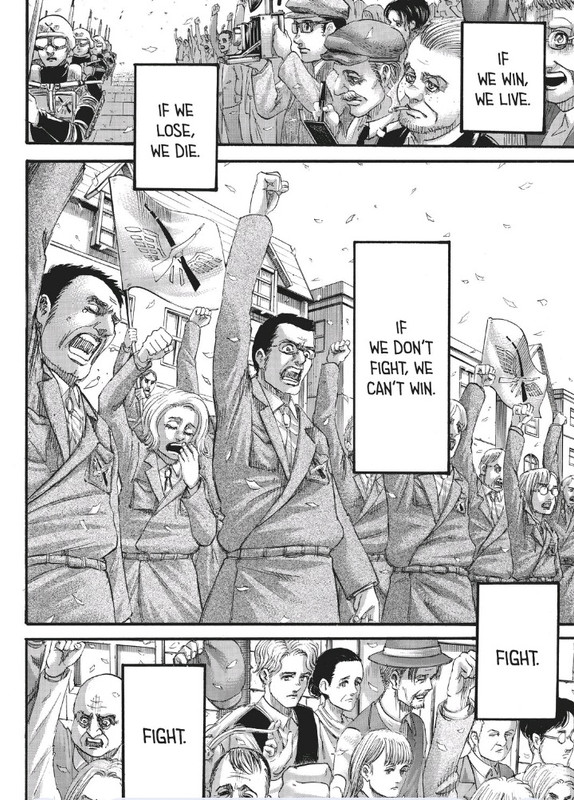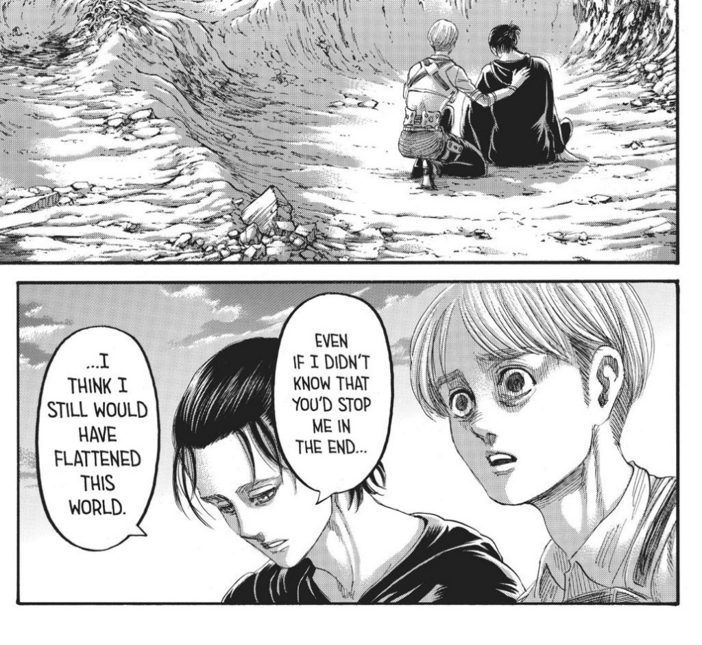 Averageenjoyer12 said: You are just overthinking. I said that Eren had no intention directly to paint them as heroes in literary terms, if by any chance they managed to stop him. He knew he would be stopped nonetheless if they worked together as a team along with external help from the other military officials and only revealed that himself to the alliance in ch133 and 139.Them stopping him would make them look like heroes as they are going against their own countryman/fellow eldian to prevent complete genocide. His direct/primary goal of starting a huge scale genocide wasn't to paint them as heroes directly. He had started it for a different purpose.You said he very well knew if acted against them they will surely come and stop him.That's means he did all that to portray them as heroes. He had the Intention to paint them as heroes. That's what I meant to say, that it wasn't his primary intention/objective to become the bad guy himself and get stopped by his former allies like Lelouch. |