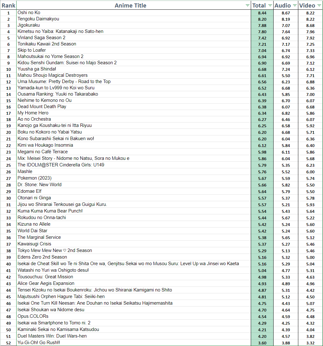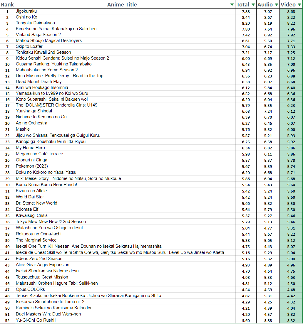 Glad for the second overall spot for my favorite opening (Tengoku Daimayou). Average rate above 8.00 so at least the show will be remembered in the AG’s halls of history.