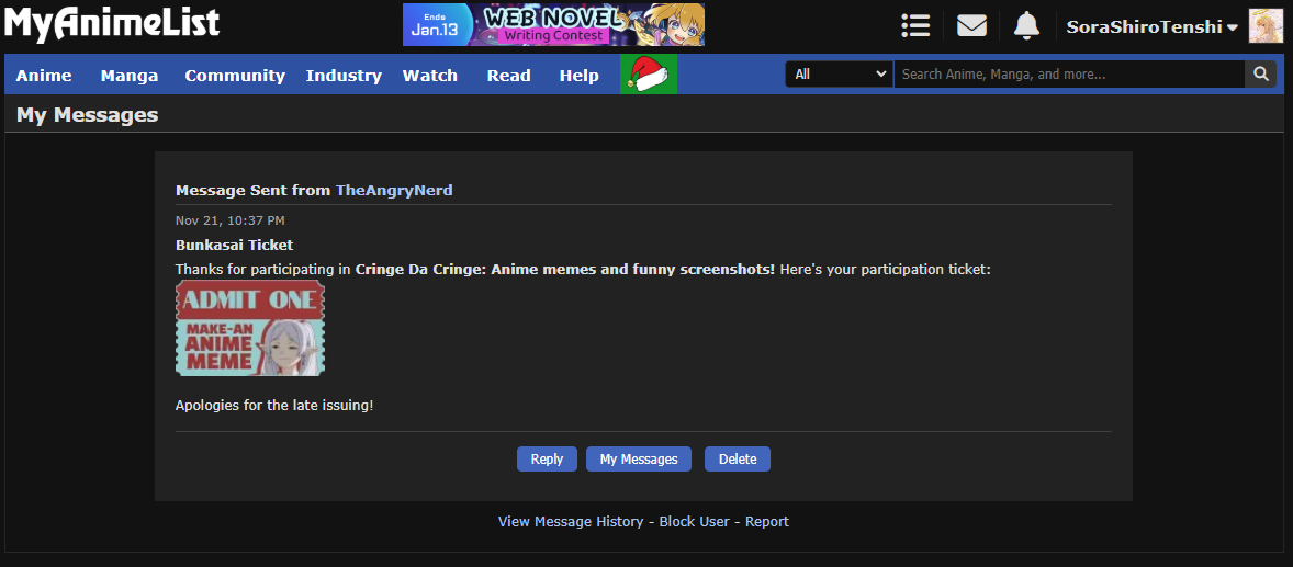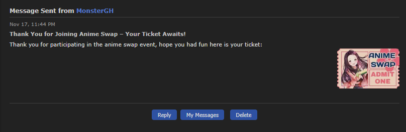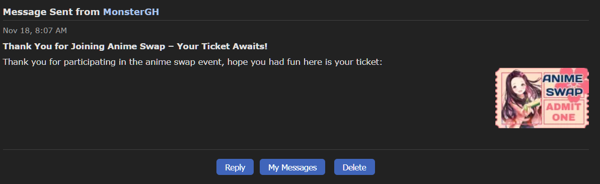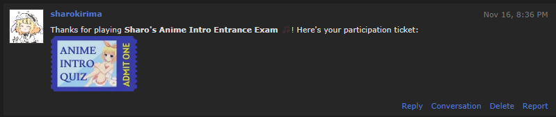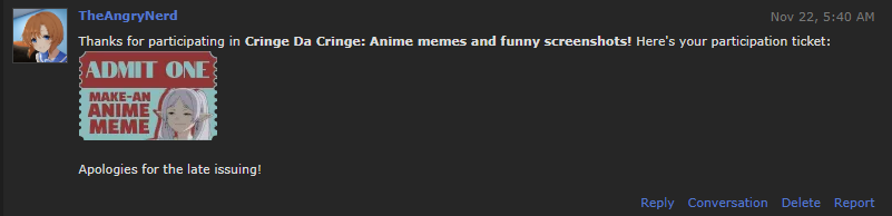 You can view all my received tickets displayed on my profile or in this album. Sharo's Anime Intro Entrance Exam: Ticket given through google form which is now closed. Here's the link to my participation post and a screenshot of my emailed results. Who's that Waifu 2024: link AWCC Open House 2024: link Anime Movie Roulette: screenshot of PM Graphic Design Contest (Voting): link List Design Contest (Voting): link CringeDaCringe - Make an Anime Meme: link Request-a-graphic (Round One): link Request-a-graphic (Round Two): link Anime Swap: screenshot of PM Music Swap: link Image Swap: link Image X Hunter: You put me in the list above so I assume you can check where you PM'd me. ;P |