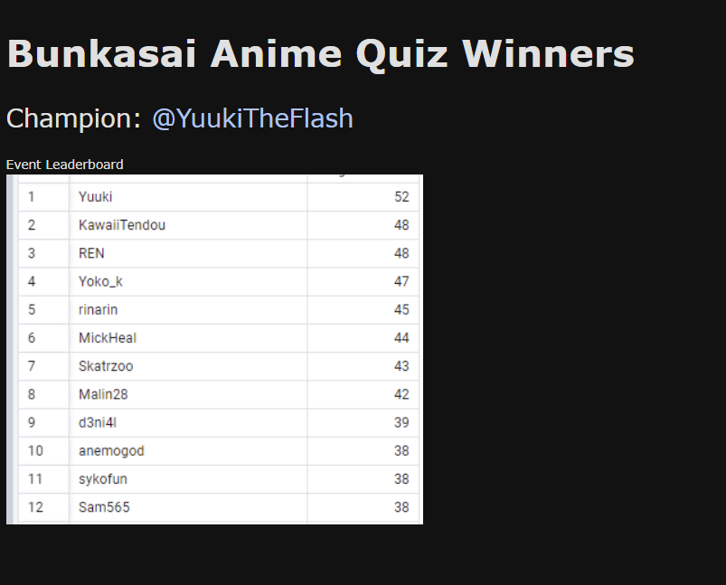 @juanix15 ty so much for hosting and making the anime quiz site, you made it a memorable and super-successful event!!!