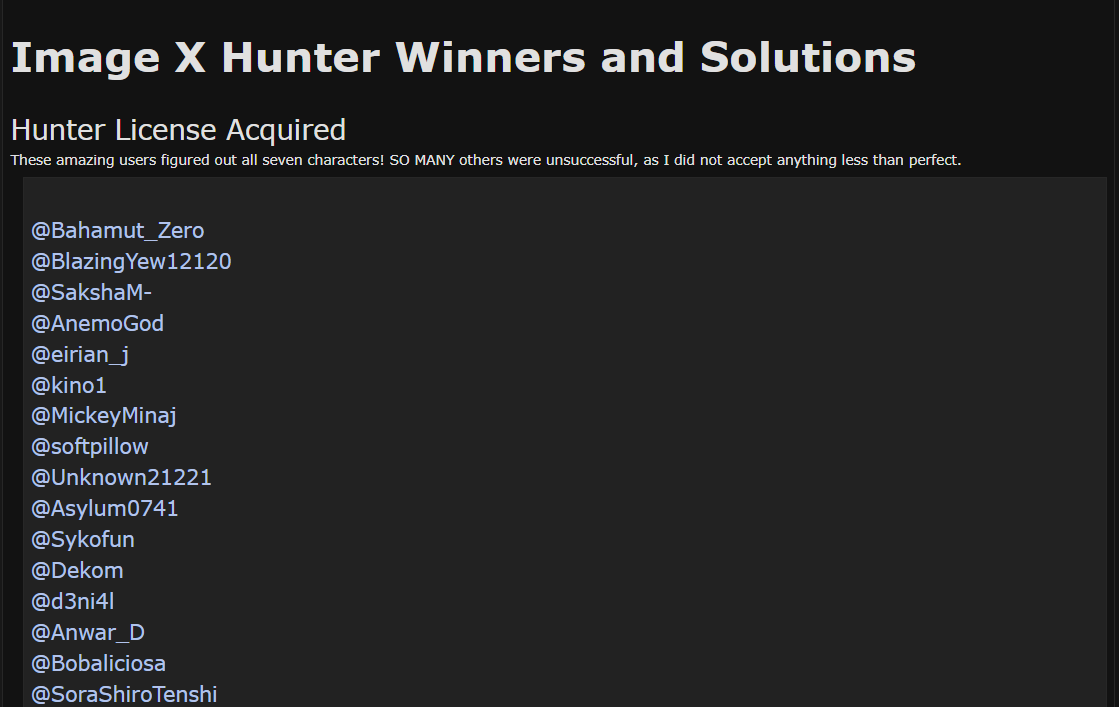 Image X Hunter Winners and Solutions Hunter License Acquired These amazing users figured out all seven characters! SO MANY others were unsuccessful, as I did not accept anything less than perfect. @Bahamut_Zero @BlazingYew12120 @SakshaM- @AnemoGod @eirian_j @kino1 @MickeyMinaj @softpillow @Unknown21221 @Asylum0741 @Sykofun @Dekom @d3ni4l @Anwar_D @Bobaliciosa @SoraShiroTenshi @Peepo0 @mega6382 @sonniet @SourZu @Darkdragon0715 @pokemonvortex @Fish4Seagulls @UnlawfulAjay @dhrvrathre @Oofmastre9000 @MickHeal @Saobenoit @Gonsarou @elsewherecw @Dam_My_Lyfe @StyxParadise @Phanuel @coffeedrops @myuniquename @vamp2000 @Ebo @Barrycade @Soonie @Sam565 @nrhkm @ZeR0695 @hikaribee89 @SheyCroix @Prophecygirl @YayakoChii @RinRintao39 @Razikel Cropped pics 1. 2. 3. 4. 5. 6. 7. Solutions with full pics All seven answers and how to solve with the Anime Planet search I linked you to :D 1) https://myanimelist.net/character/116275/Albedo/pics 2) https://myanimelist.net/character/41135/Shaiapouf/pics 3) https://myanimelist.net/character/5557/Reika_Houjou/pics 4) https://myanimelist.net/character/24512/Masami_Iwasawa/pics 5) https://myanimelist.net/character/32639/Eris/pics 6) https://myanimelist.net/character/177572/Myne/pics 7) https://myanimelist.net/character/26845/Godzilla/pics List Design Contest Winners Congrats to all!! :D Install a custom layout or make yours over with our guides. Champion: @SunnySummerDay anime list | β forum thread to use it Runner ups: @LXYXN Anime List @MickHeal Anime List @SPCTRE Anime list - Use the design @Bobaliciosa Anime List Graphic Design Contest Winners Champion: @Stuntdrath Runner ups: @Phanuel @pokemonvortex Movie Roulette Completionists https://myanimelist.net/forum/?topicid=2188093&show=350&msgid=72043277 AWWC Completionists https://myanimelist.net/forum/?goto=post&topicid=2189600&id=71998929 How to apply for the Bunkasai Honor Roll Have you collected 12 or more tickets? We can feature your username in our honor roll on the club wall! Leave a reply in this thread linking to all participation posts (or screenshots?) where you earned any participation ticket, competitor ticket, or win ticket. Note: Competitor and winning tickets count as separate tickets from default participation tickets that say "Admit One". Note 2: Request a graphic had two separate admission tickets, one for each round (thread). Note 3: If you solved the Image X Hunter challenge, you don't need to share a screenshot of our DM if you dont want to, just let me know you solved it and I can verify I sent you the DM (or I can check the list above lol). Want to give feedback? Feel free to leave replies below with your feedback, or you can use this form to submit anonymously https://docs.google.com/forms/d/e/1FAIpQLSco-nofKhdJYWsjHR-flKKS9KvKP40Zt7WshrcRG4S7B_d8OA/viewform?usp=sharing Info on badges and requested graphics If you submitted a stamp rally, you should be getting your badge soon, please give it time, many users are already getting their badge so check your profile. If you requested a custom signature or profile pic, we are still working on submissions (signatures almost done!), and I'll ping you in the future with your completed designs. They'll be delivered in the thread you requested them in, so check the threads now and in the future for your completed request :D Signatures: https://myanimelist.net/forum/?topicid=2188230 Profile pics: https://myanimelist.net/forum/?topicid=2190379 |