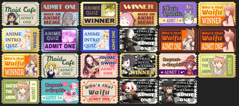 | Thanks so much for the fun event, I had a blast doing all these different events. Thanks for everyone who helped make this come to life and Happy Holidays. 1-Sharo's Anime Intro Entrance Exam [Ticket] 2-Bunkasai Anime Quiz [Ticket by E-mail] 3-Bunkasai Anime Quiz Winning Ticket [Leaderboard] 4-2024 Female Seiyuu Scramble [Ticket received in the googles form] 5-Who's that Waifu Participation Ticket 6-Who's that Waifu Winner Ticket 7-Anime Watching Challenges Club Open House 8-Anime Movie Roulette [Ticket via PM] 9-Lowest Budget Voice Acting School 3 10-Cringe Da Cringe [Ticket] 11-Request-a-graphic 12-Anime Swap [Ticket via PM] 13-Music Swap 14-Image Swap! Participation Ticket 15-Image X Hunter Winners Ticket, Ticket via PM. |