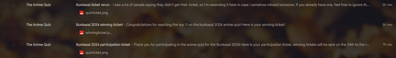 | Ty everyone out there for making this possible! Though it was my first Bunkasai, the fun was just the same :) Notes: 1. The pics are linked 2. The last 2 tickets were obtained via the events' Google form itself, so I don't have any links for them. Again, Bunkasai Organizers and everyone who helped, Banzaiiiiiii ! |