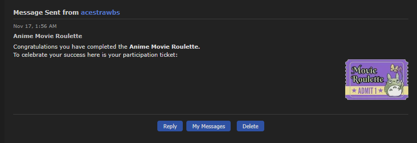 | @MickHeal And you get one more with the list design winning ticket :D https://myanimelist.net/forum/?goto=post&topicid=2190370&id=72066161 |