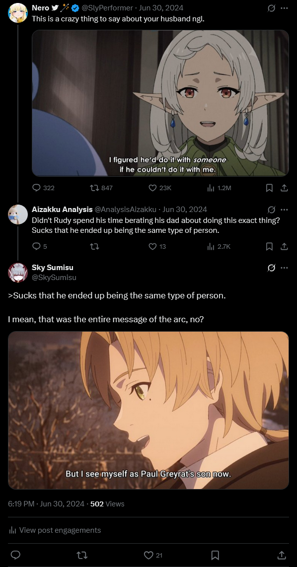 WaterMage said: - Reincarnated characters having romantic relationship with same age charcter is pedophila - Mushoku Tensie encourages pedophile When I complained that Rudeus is voiced by an adult, I was told it's fitting because he's an adult. You can't have it both ways. Either he's an adult and a pedophile, or he's a child and the casting is inappropriate. |