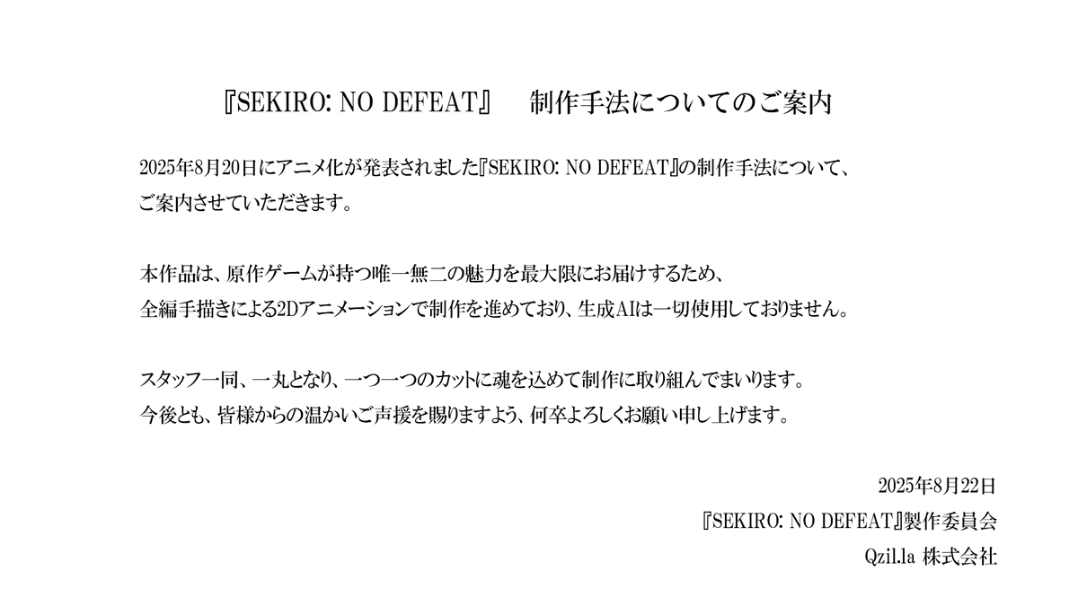 @RippleLover And the company came out with a statement today saying what they initially said in their announcement: That Sekiro will be fully 2d hand drawn, no AI used (at least for this specific series, we do know they plan to for other stuff in the future sadly, so they are still pretty sucky)