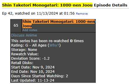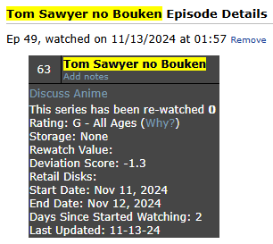 Anime Milestones (More milestones listed on Profile.) 200 Completed = Sword Art Online II (09.02.2024) 300 Completed = Mameshiba (12.27.2024) 400 Completed = Kimi no Na wa. (06.27.2025) 30 Days = 06.06.2024 40 Days = 09.27.2024 50 Days = 04.01.2025 |