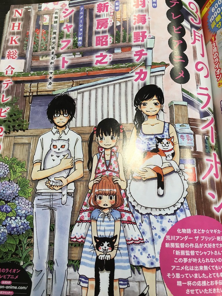 The second issue of this year's Young Animal magazine announced on Friday that the TV anime adaptation of Chika Umino's 3-gatsu no Lion (March Comes in Like a Lion) manga will be produced by animation studio Shaft. Akiyuki Shinobu is directing the anime series, which will air on NHK in Fall 2016.Synopsis