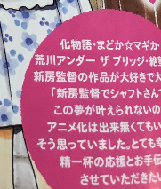 she says that she loves Shaft and Shinbo work and her dream was to have her work animated by shaft and that she is very happy.