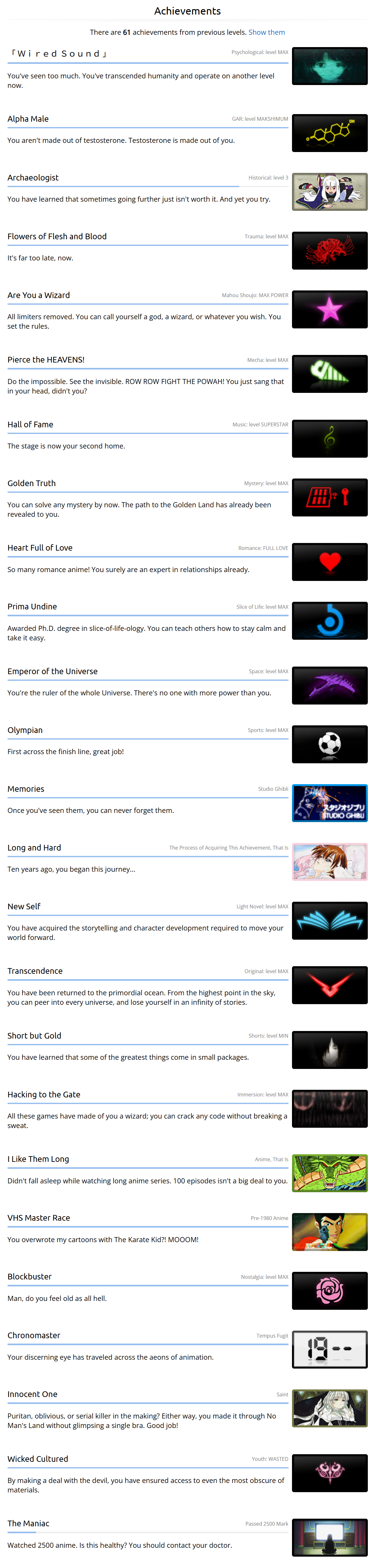 Anime original start dates: These dates are for shows I originally started watching, but did not finish (either dropped or put on hold for a long time). I have since watched these shows and replaced the original start date with the new start date.