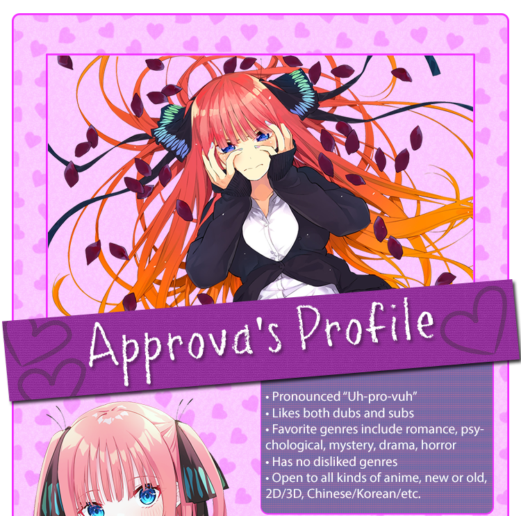 About Me! Hi! 😊👋 My name is Claire, but I go by Approva on here. I have been watching anime for over a decade now! My first was Highschool of the Dead (if we exclude the Pokémon I watched as a kid), which one of my close friends recommended to me. I definitely do not recommend that as a first anime though, as that anime could easily give someone the wrong impression about the medium! Despite that, I continued to watch more and more, discovering my love for slice of life/drama/romance shows (which dominate my favorites now) shortly thereafter. I used to be a member of the "no drop master race", but realized that I did not have enough time in my limited lifespan to do all of the things I wanted to do. As such, I started dropping anime in February 2018. I also used to watch every anime that came out each season, which I stopped doing during the Winter 2018 season. Due to this, I have seen every anime released from Summer 2014 to Fall 2017 to completion. I was a masochist then. I still partake in seasonal anime, but will drop those that I do not like. Outside of anime, I enjoy video games, reading (mostly manga honestly), music, Asian dramas, and film. I’ve included some of my favorites below! Some of my favorite games include: