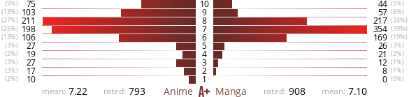 Anime (rewatchable) 10 Todo fue perfecto. / All was perfect. 9 Me encantó.♡ / I liked so much ♡ 8 Es muy bueno. / Really great. 7 Cumplió con su género. Entretenido. / It fulfilled with the genre. Entertained. 6 Meh, estuvo bien para pasar el rato. / Meh, it was ok to kill time. 5 No me dejó ningún sentimiento. / I don't feel anything for this. 4 Placer culposo; es malo, pero me gustó. / Guilty pleasure: It's bad, but I liked it. 3 No me gustó. / Dislike. 2 Verla me causó indigestión. / It was painful to me see it. 1 No se la recomendaría ni a mi peor enemigo. / I do not recommend it even to my worst enemy. Sin score (-) No sé qué pensar. / I don't what to think about this.